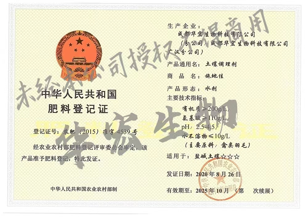 成都華宏生物科技有限公司根據(jù)我國目前土壤狀況采用生物化工技術(shù),研發(fā)出了富含有機養(yǎng)分和有機水溶性高分子的高科技新產(chǎn)品。獲得兩項中國發(fā)明專利,專利:ZL200910053488. 專利號:ZL201511013688.8 。 本專利的核心工藝采用生物化工技術(shù)《近臨界超低酸水解清潔化新工藝》制得聚合氨基酸,再經(jīng)有機螯合成聚合氨基酸有機物,富含有機養(yǎng)分和水溶性高分子。